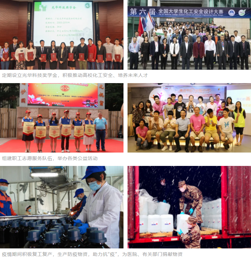 感恩當下,回饋社會。作為一名企業(yè)公民,光華科技深刻意識到所肩負的社會責任,在追求企業(yè)可持續(xù)發(fā)展之際,保護環(huán)境、回饋社會,為股東、員工、合作伙伴、社會及所有利益相關者創(chuàng)造福祉。一直以來,光華科技積極投身于社會公益事業(yè),組建活躍于社區(qū)的職工志愿服務團隊,以實際行動擔當社會責任。結合企業(yè)定位與行業(yè)特性,自2003年起,公司先后在中山大學及華南理工大學等高校設立光華獎學金,鼓勵學子積極進取、奮發(fā)向上;開展高校實驗室安全管理經(jīng)驗分享。在疫情期間,光華科技積極響應中央、省市政府的號召,在做好本單位防疫工作的同時,密切關注各地防疫重要物資需求情況,積極復工復產,捐贈支援前線,助力打好疫情防控阻擊戰(zhàn)……